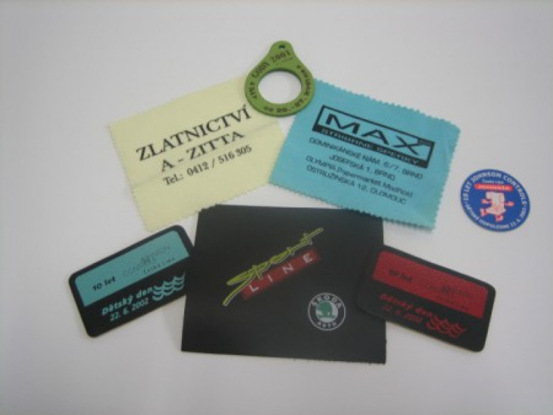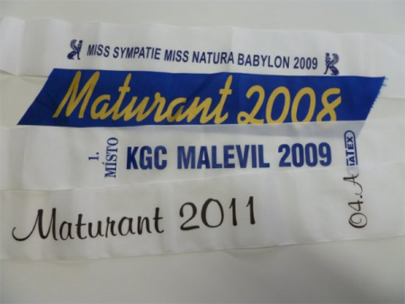 Dále pak sportovní oděvy a vlajky, reklamní tabule a banery, hrnky a skleničky. Vyrábíme šerpy a stuhy různých délek a barev.